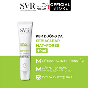 Kem Dưỡng Giảm Mụn, Thông Thoáng Lỗ Chân Lông SVR Sebiaclear Mat + Pores là kem dưỡng chứa các thành phần dược đặc trị, giúp điều tiết lượng dầu thừa trên da, giảm bã nhờn và thu nhỏ lỗ chân lông trong vòng 8 giờ, hỗ trợ cải thiện các vấn đề về mụn, mang đến làn da tươi khỏe.