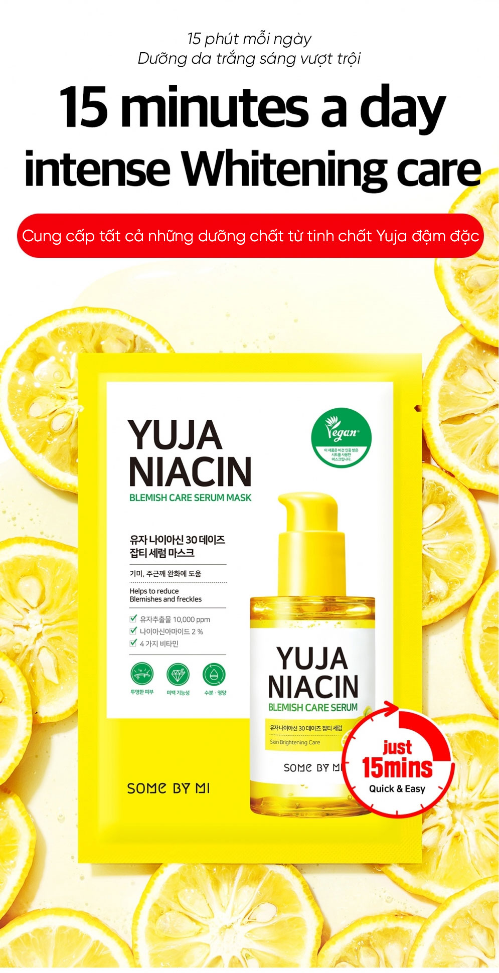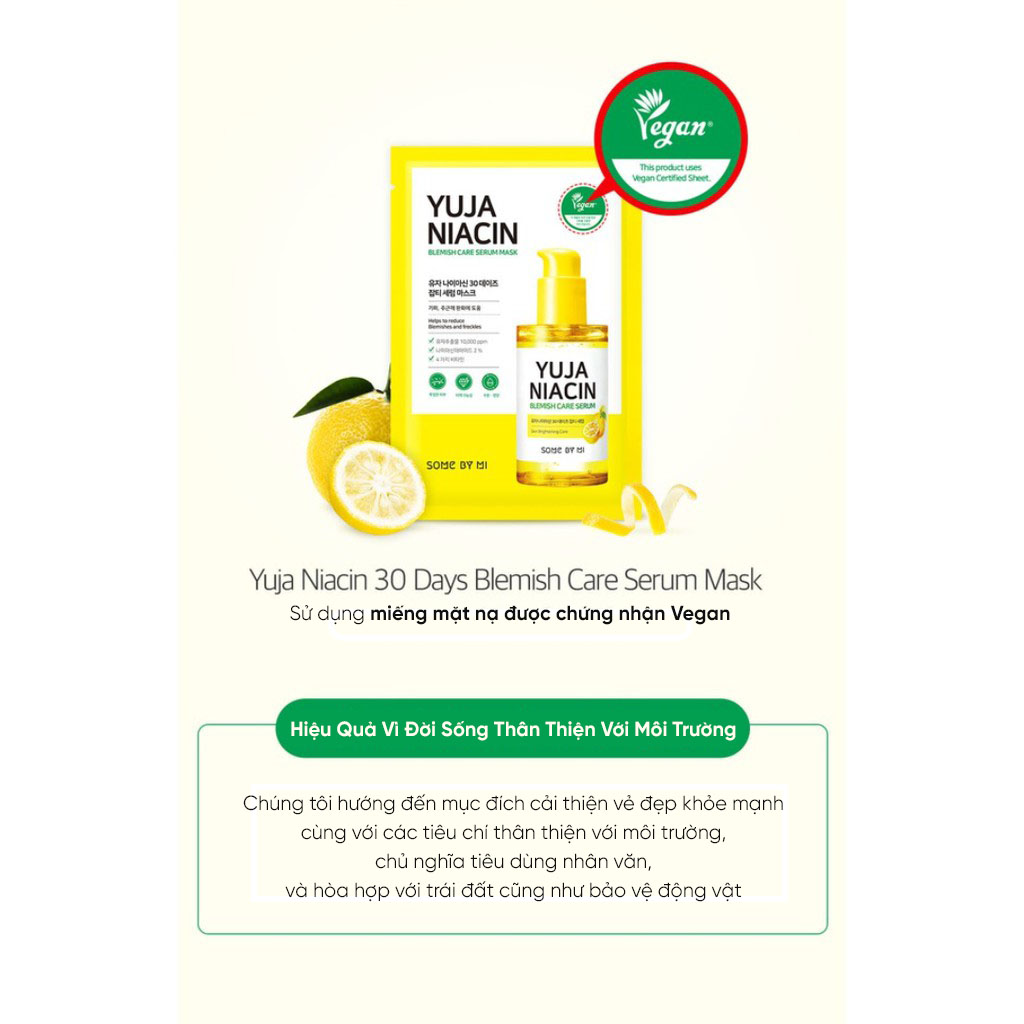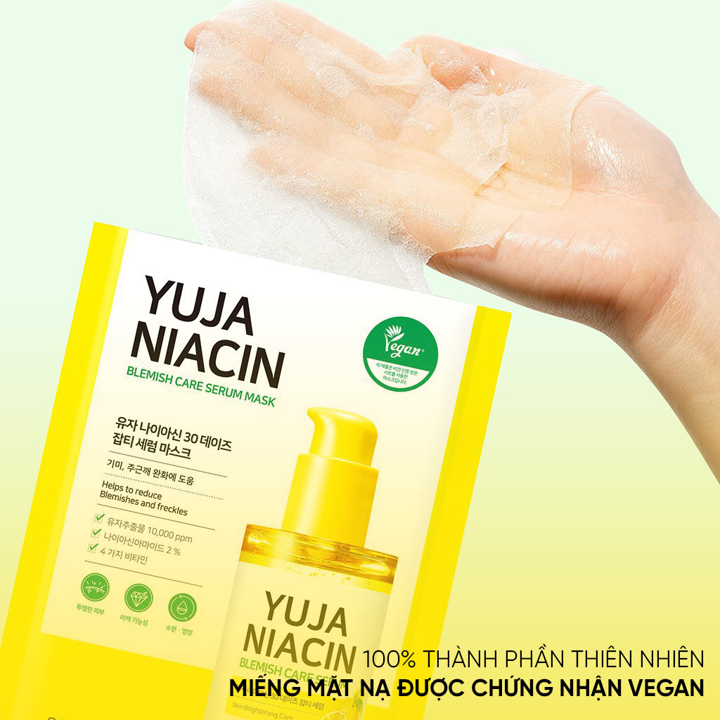 Mặt Nạ Sáng Da SOME BY MI Yuja Niacin Blemish Care Serum Mask chứa các thành phần dưỡng trắng sáng da như chiết xuất từ quýt Yuja (quả thanh yên), Niacinamide 5%, Glutathione, Arbutin và thành phần dưỡng trắng Resmelin được cấp bằng sáng chế giúp dưỡng trắng hiệu quả.