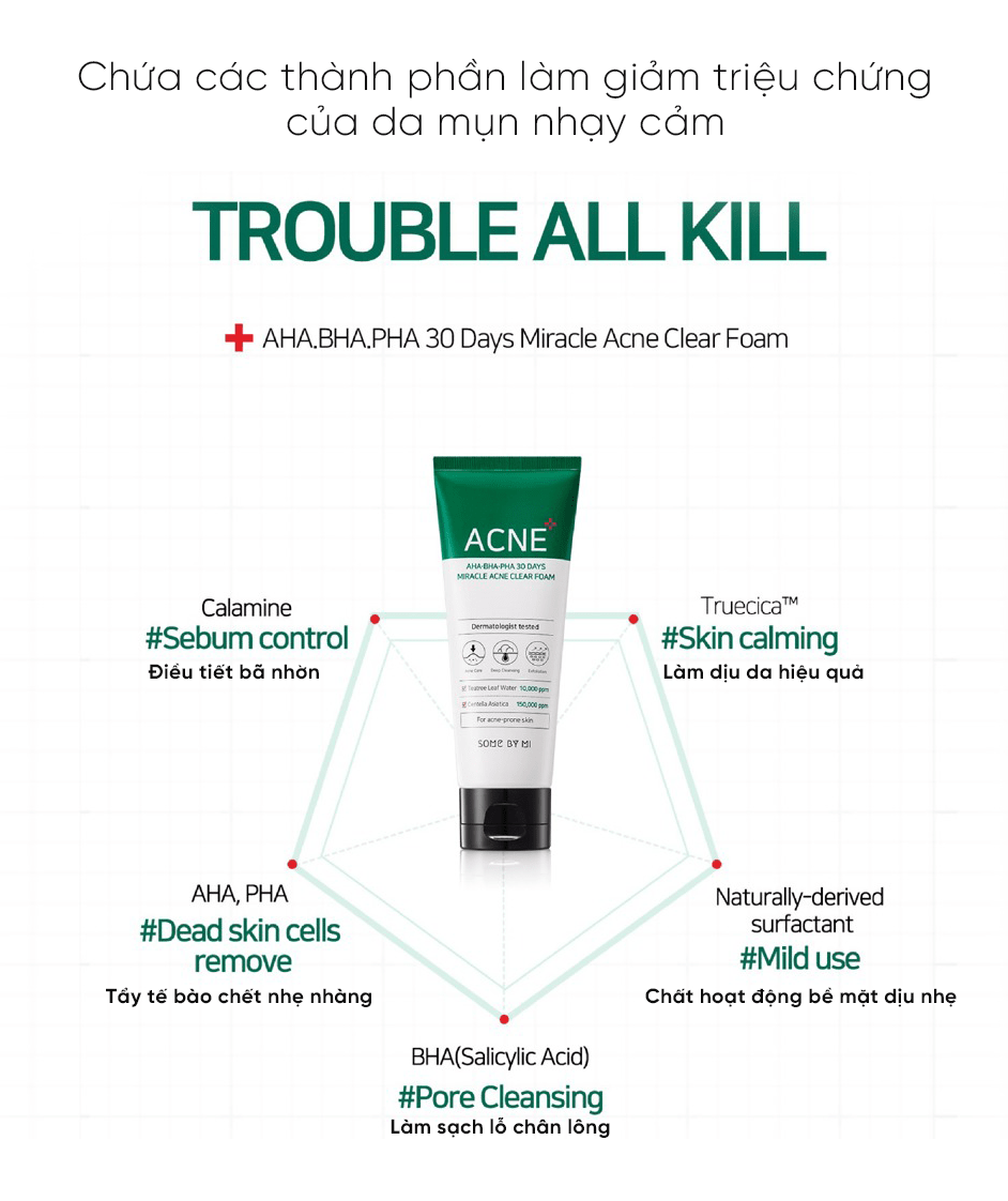 Some By Mi 30 Days Miracle Acne Clear Foam chứa 160.200 ppm hợp chất Truecica™ độc quyền giúp làm dịu, củng cố lớp bảo vệ da, đồng thời ngăn da khỏi các tác động gây hại từ môi trường.